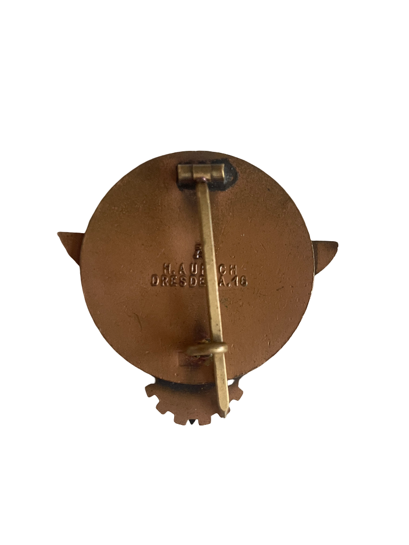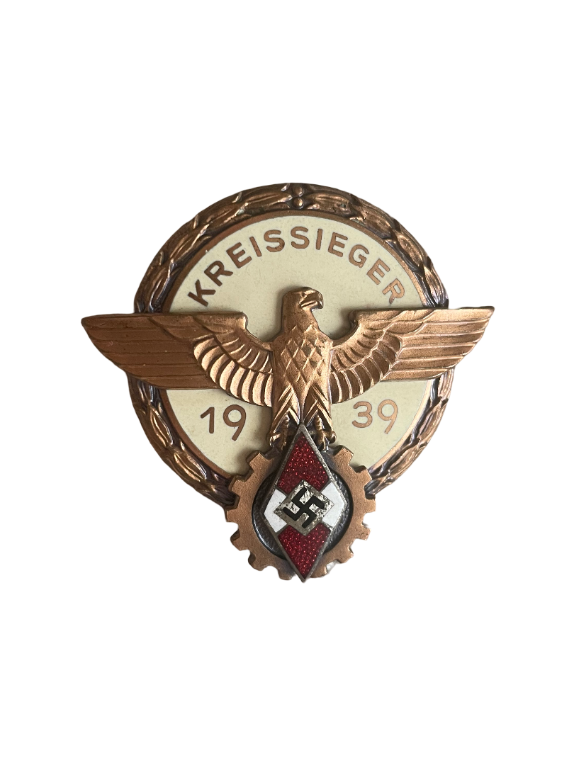 Het Kreissieger 1939 erekenteken is een onderscheiding uitgereikt aan winnaars op districtsniveau tijdens de Reichsberufswettkampf, Het achterzijde is gemerkt met "H. Aurich Dresden A.16", wat verwijst naar de erkende fabrikant Hermann Aurich uit Dresden.